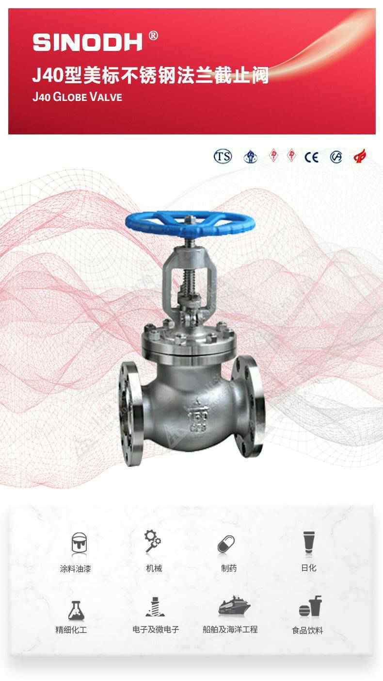 J40型美标不锈钢截止阀,为上海富贵电子竞技运营有限公司自主研发生产。本产品的设计制造符合美国国家标准ANSIB16.34,美国石油学会标准AP1 6D和AP I 600要求,产品结构紧凑密、刚性好、封性性能优秀是一种最常见的启闭阀,利用闸板的上下工作来接通(全开)和截断(全关)管道中的流体介质。